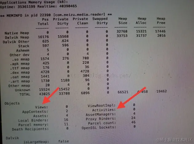 2)多次进入退出后的占用内存`TOTAL`不应变化太大;