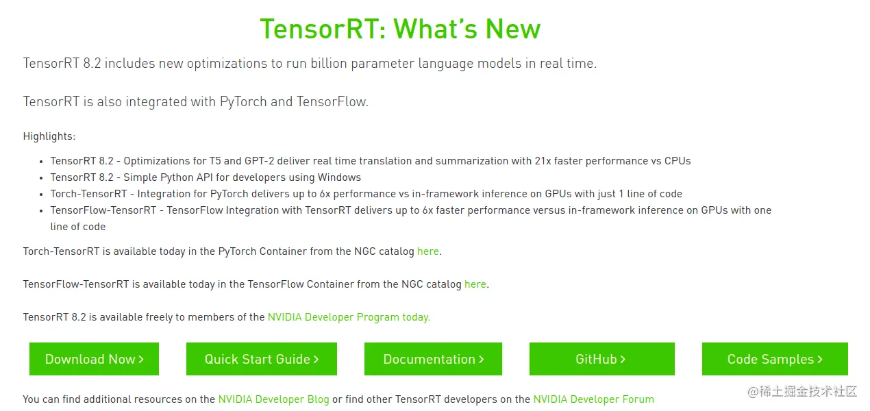 TensorRT 是 NVIDIA 自家的高性能推理库,其 Getting Started 列出了各资料入口,如下:
