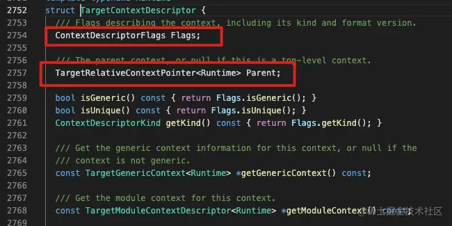 继续向上寻找会发现TargetTypeContextDescriptor继承自 TargetContextDescriptor的结构体,这个结构体提供了Flags、Parent这两个值