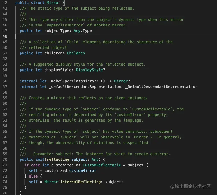 这是Mirror最常用的初始化方法,接受一个Any类型的参数,if case的写法是用来判断当前的subject是否遵循了CustomReflectable协议,如果遵循了可以直接调用