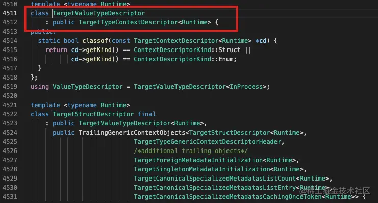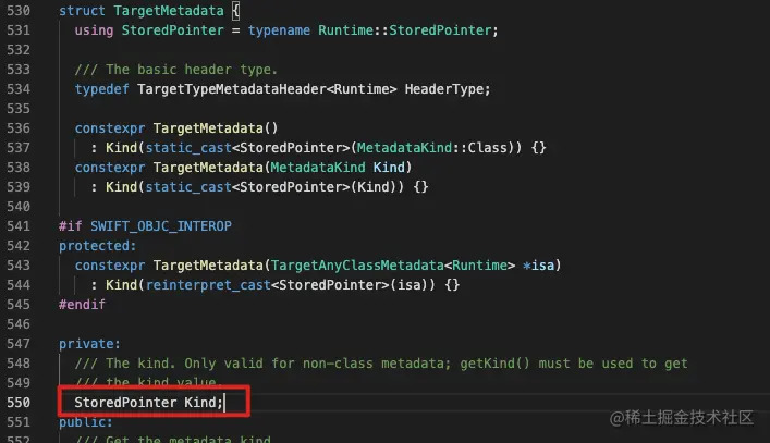 继续向上寻找 可以看到 TargetValueMetadata 继承于 TargetMetadata,而 TargetMetadata提供了一个 StoredPointer类型的Kind