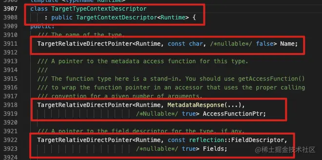 继续向上寻找可以看到TargetValueTypeDescriptor继承自TargetValueTypeDescriptor,再找一层就能看到TargetValueTypeDescriptor继承自TargetTypeContextDescriptor,TargetTypeContextDescriptor这个类有TargetRelativeDirectPointer这个类型的三个值:Name、AccessFunctionPtr、Fields,其中Fields里存储的FieldDescriptor信息我们也需要还原一下