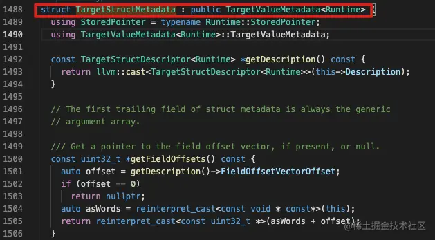 想要还原TargetStructMetadata,首先要了解TargetStructMetadata在源码中的数据结构,下面来源码中看一下:打开源码搜索TargetStructMetadata 可以定位到 Metadata.h 这个文件可以看到 TargetStructMetadata