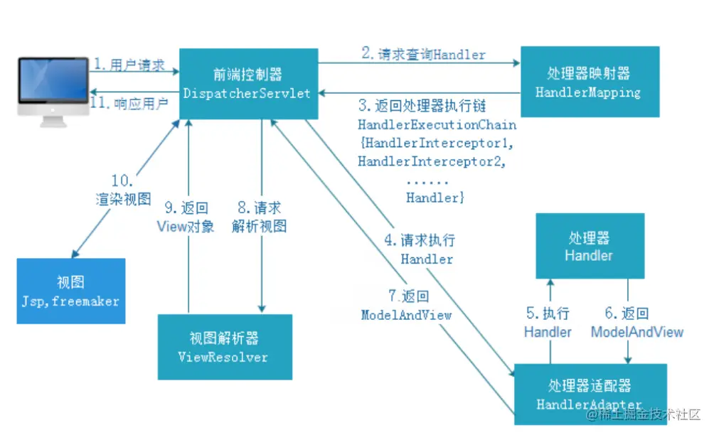 HandlerMapping是用来查找Handler的,也就是处理器,具体的表现形式可以是类,也可以是方法。比如,标注了@RequestMapping的每个方法都可以看成是一个Handler。Handler负责具体实际的请求处理,在请求到达后,HandlerMapping的作用便是找到请求相应的处理器Handler和Interceptor