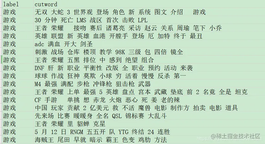 writer.writerow(['label','cutword'])#使用csv.DictReader读取文件中的信息 labels = [] contents = [] with open(filename, "r", encoding="UTF-8") as f: reader = csv.DictReader(f) for row in reader: #数据元素获取 labels.append(row['label']) content = row['content'] #中文分词 seglist = txt_cut(content) #空格拼接 output = ' '.join(list(seglist)) contents.append(output) #文件写入 tlist = [] tlist.append(row['label']) tlist.append(output) writer.writerow(tlist) print(labels[:5]) print(contents[:5]) fw.close()#----------------------------------------------------------------------- #主函数 if name == 'main': fenci("news_dataset_train.csv", "news_dataset_train_fc.csv") fenci("news_dataset_test.csv", "news_dataset_test_fc.csv") fenci("news_dataset_val.csv", "news_dataset_val_fc.csv")