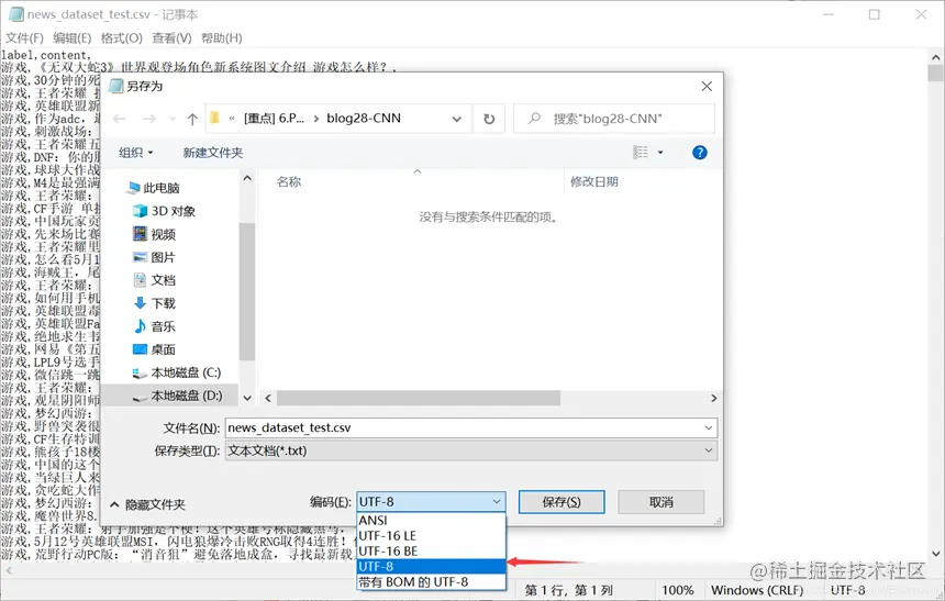 注意,如果报错“UnicodeDecodeError: ‘utf-8’ codec can’t decode byte 0xce in position 17: invalid continuation byte”,需要将CSV文件保存为UTF-8格式,如下图所示。