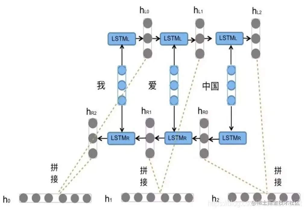 BiLSTM是Bi-directional Long Short-Term Memory的缩写,是由前向LSTM与后向LSTM组合而成。它和LSTM在自然语言处理任务中都常被用来建模上下文信息。前向的LSTM与后向的LSTM结合成BiLSTM。比如,我们对“我爱中国”这句话进行编码,模型如图所示。