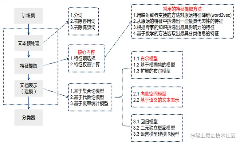 牛亚峰老师将传统的文本分类流程归纳如下图所示。在传统的文本分类中,基本上大部分机器学习方法都在文本分类领域有所应用。主要包括: