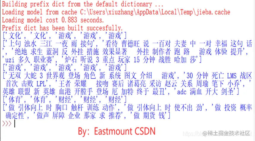 #----------------------------------------------------------------------- #Jieba分词函数 def txt_cut(juzi): return [w for w in jieba.lcut(juzi) if w not in stop_list]