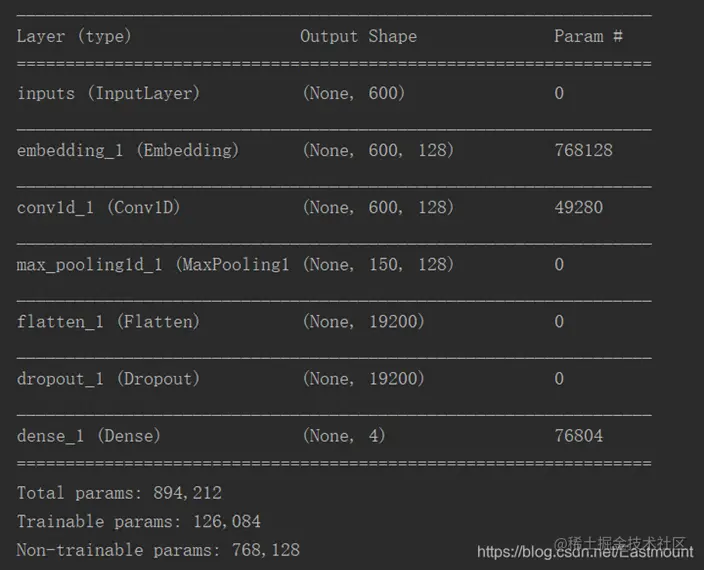 num_labels = 4 inputs = Input(name='inputs',shape=[max_len],dtype='float64') layer = Embedding(max_words+1, 256, input_length=max_len)(inputs) #lstm = Bidirectional(LSTM(100, dropout=0.2, recurrent_dropout=0.1, return_sequences=True))(layer) bilstm = Bidirectional(CuDNNLSTM(128, return_sequences=True))(layer) #参数保持维度3 layer = Dense(128, activation='relu')(bilstm) layer = Dropout(0.2)(layer)