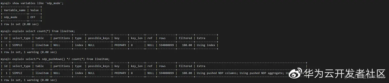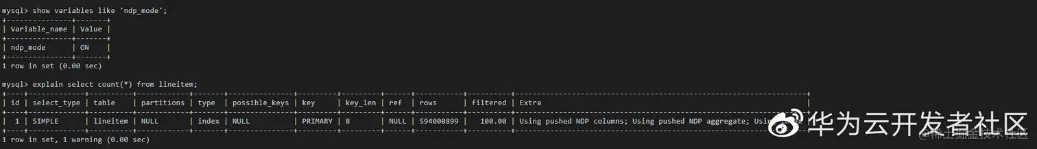 | 1 | SIMPLE | lineitem | NULL | index | NULL | PRIMARY | 8 | NULL | 594000899 | 100.00 | Using pushed NDP columns; Using pushed NDP aggregate; Using index |