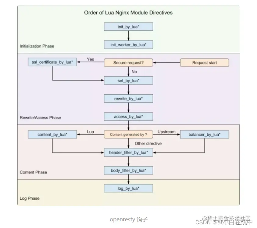 - balancer_by_lua:在 content 阶段执行的所有反向代理模块,在选择上游 Server 时都会回调 init_upstream 钩子函数,OpenResty 将其命名为 balancer_by_lua;