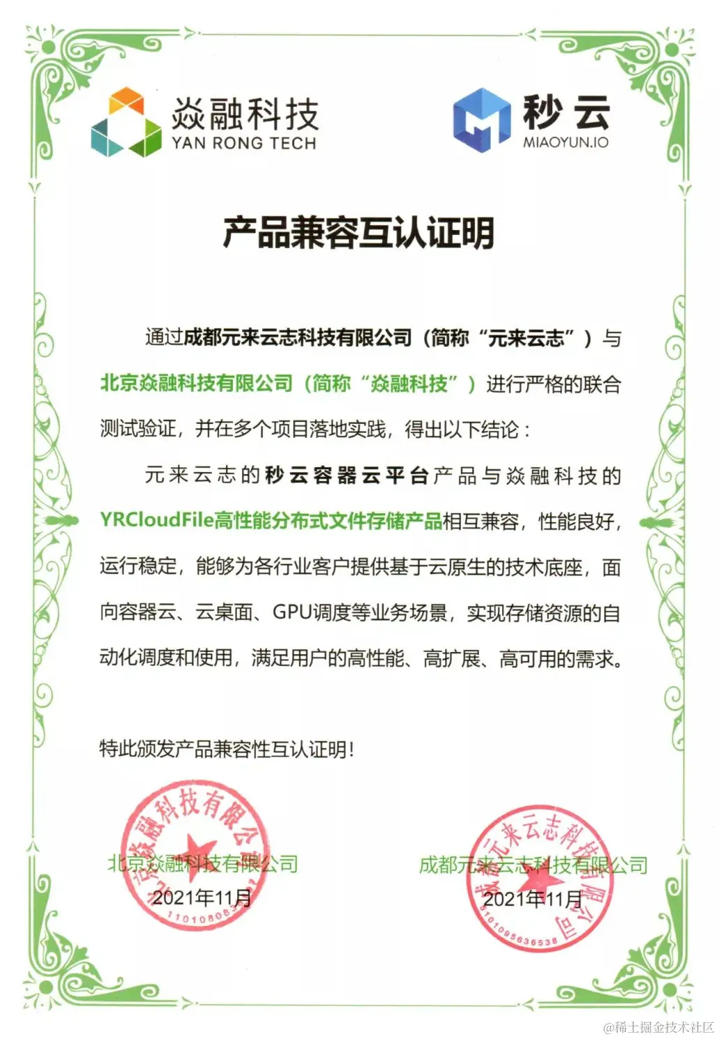 此次,焱融科技与秒云的产品兼容性认证顺利完成,不仅为双方后续合作打下更坚实的基础,更是为推进数字化生态的建设添砖加瓦,满足更多企业在数字化应用场景中,IT 系统对于云原生应用,以及海量数据高性能、高可用、高扩展的需求,支撑企业业务敏捷交付,助力企业加速云原生落地进程。