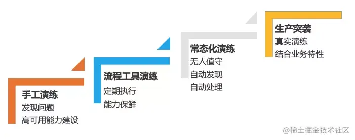 从演练工具和落地实施来看,一个组织的故障演练经常分为几个发展阶段:手工演练,流程工具自动化演练,常态化无人值守演练,生产突袭演练。