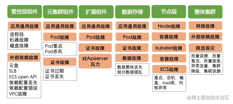 在阿里云原生的架构上,我们整理了如下所示的演练模型供参考,在这个高可用能力模型中,我们根据系统架构按照管控层组件、元集群组件、扩展组件,数据存储,节点层,整体集群进行区分,在每个模块中有一些通用的故障可以互相借鉴。