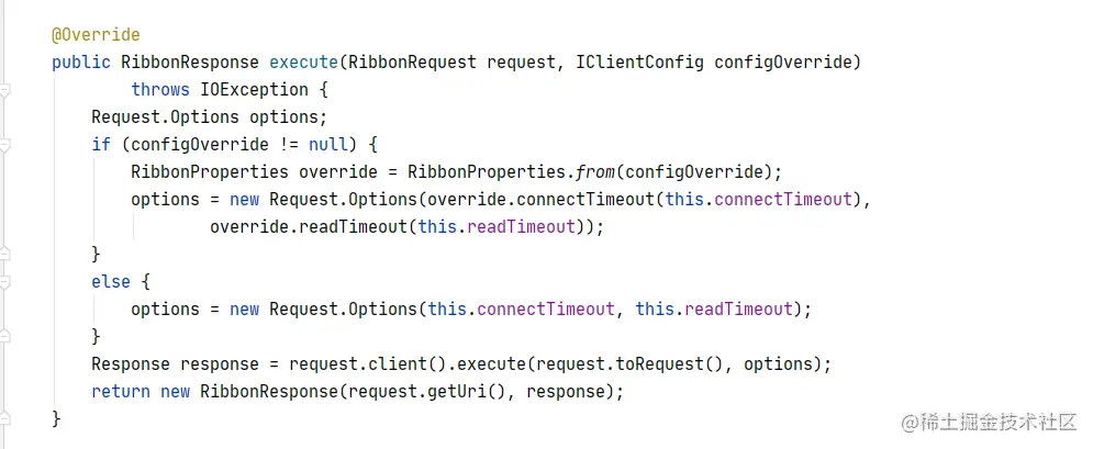 我们可以在FeignLoadBalancer的execute方法中看到当IClientConfig为空的时候进行覆盖超时时间,默认是取Ribbon的超时时间,并不是Feign Options默认的超时时间。