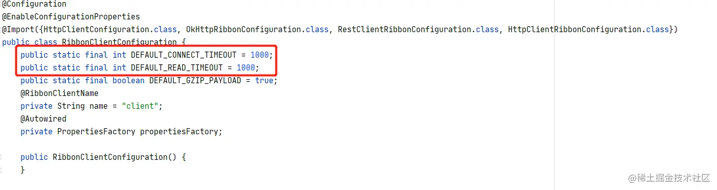 可以看到RibbonClientConfiguration默认配置的读超时和连接超时时间1000毫秒=1秒,在没有配置超时情况下当前这个超时是符合本次调用超时错误触发。