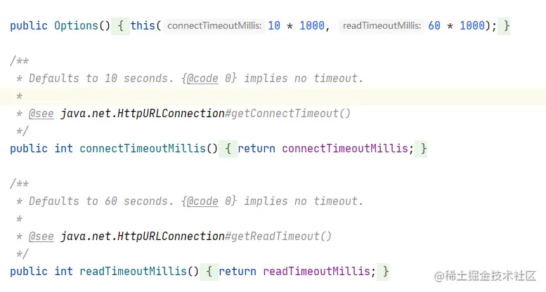 通过跟踪代码可以在feign.Request内部类Options构造函数默认配置连接超时10秒,读超时60秒。然而本次调用请求仅耗时1秒左右就被掐断连接提示超时错误,初步判断默认这个超时配置并未生效导致。