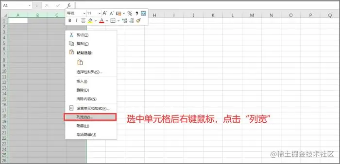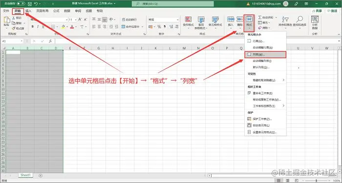 - 右键或者依次点击上方的【开始】、“格式”、“列宽”。