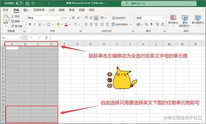 步骤1.打开一个excel表格后,我们选中所需要调整列宽的单元格部分,以下图为例,选中ABCD这四部分的单元格(该操作是全选对应的全部单元格,如果想自由选择,则鼠标放在英文下面的部分即可);