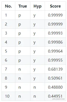 一个分类算法,找个最优的分类效果,对应到ROC空间中的一个点。通常分类器的输出都是Score,比如SVM、神经网络,有如下的预测结果:
