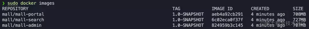 执行 sudo docker images,应该能看到 mall/mall-admin,mall/mall-portal,mall/mall-search 的 1.0-SNAPSHOT 版本的镜像。