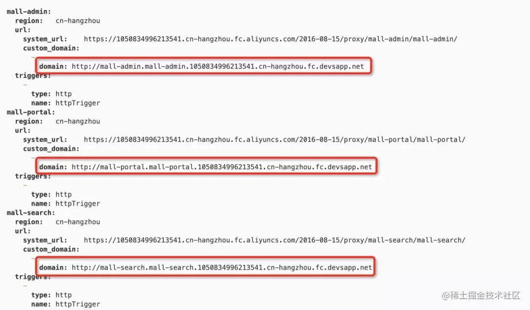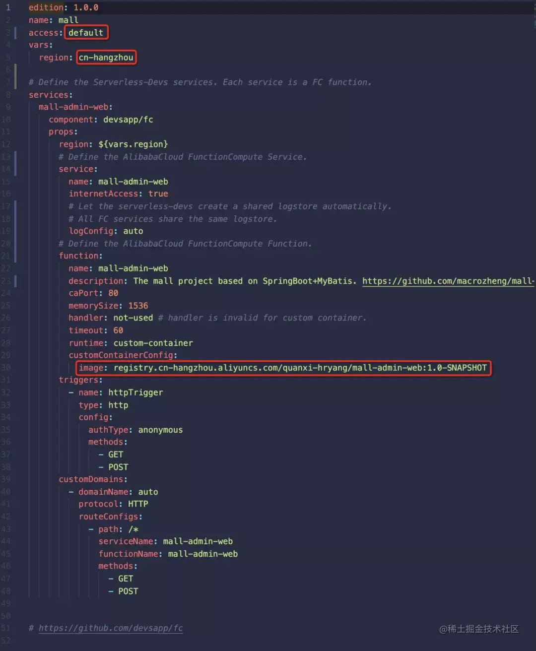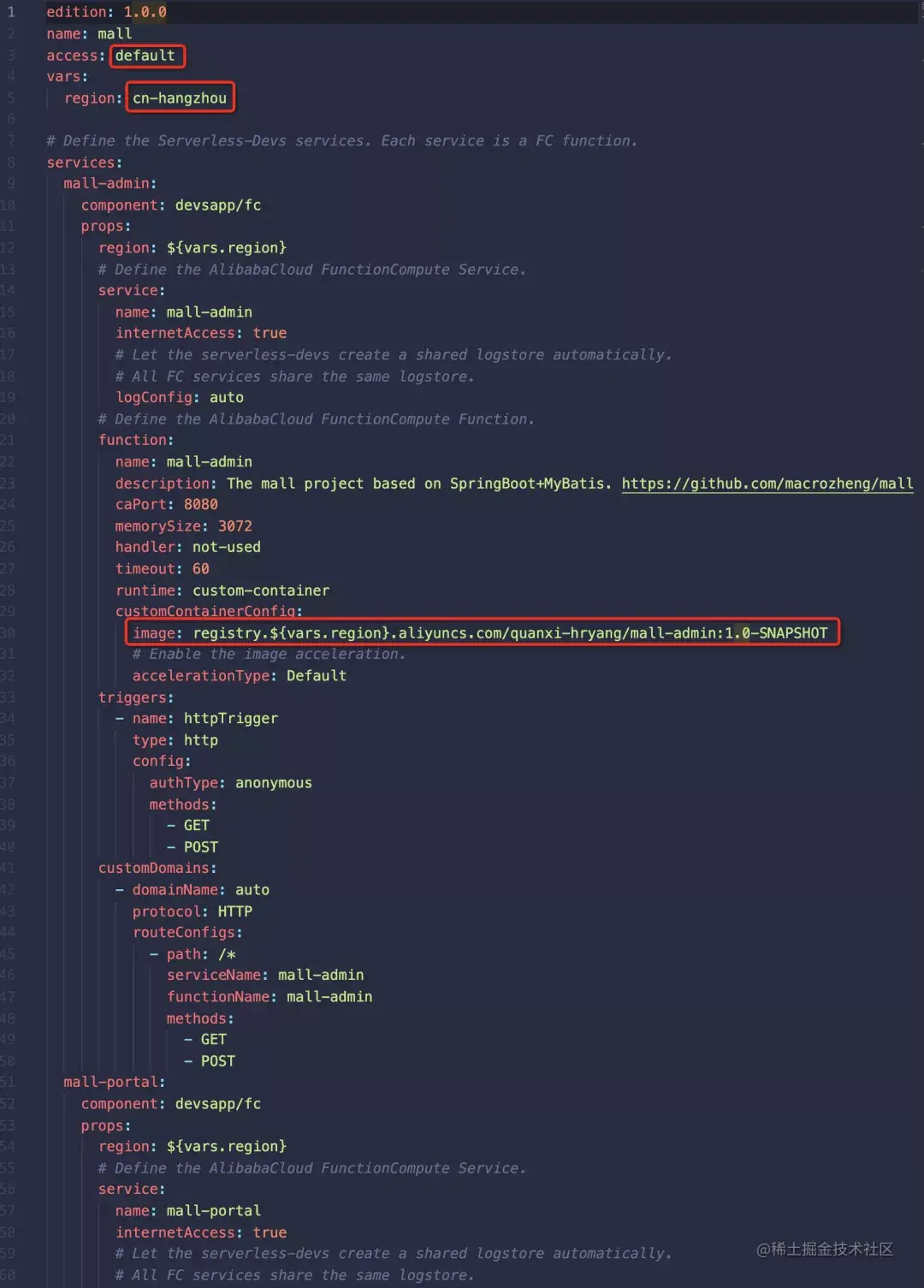 如下图所示,我们在函数计算上定义了名为 mall-admin 服务及其下的 mall-admin 函数。函数中定义了 port,内存大小,超时时间,运行时等属性。红框中的内容是您需要根据自己的配置修改的。