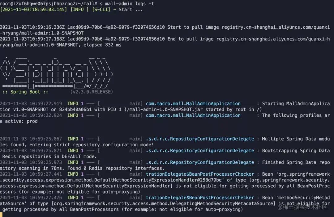 - 也可以使用 s mall-admin logs -t 以跟随模式实时显示当前时间点之后的日志;