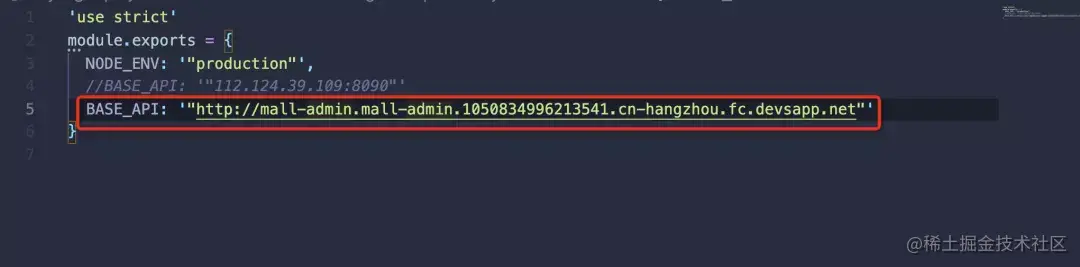 修改 config/prod.env.js ,将其中的 BASE_API 改为之前在函数计算上部署成功的 mall-admin 的 endpoint。