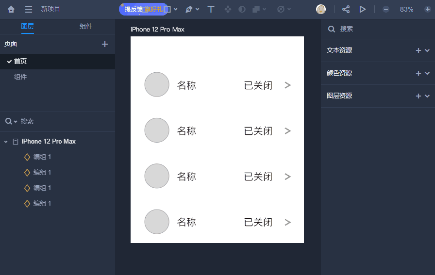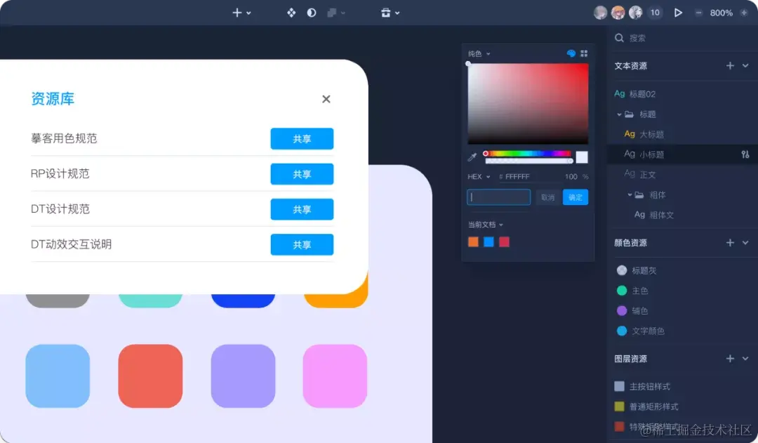 你可将常用的颜色、文本样式、图层样式保存为资源,还可以搭配起来重复添加为组件资源,一旦资源修改后,项目中引用的所有实例将会自动更新。并且所有资源都能共享到团队,实现快速复用,大大提升了设计的效率。