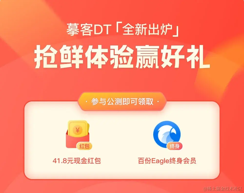 在公测期间,所有参与试用摹客DT的用户只要提交反馈建议,就能领取41.8元大额现金红包(人人有份),还有100份Eagle终身会员等你拿!