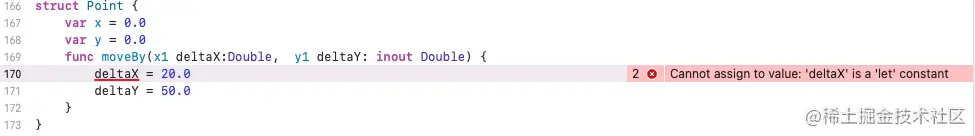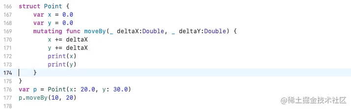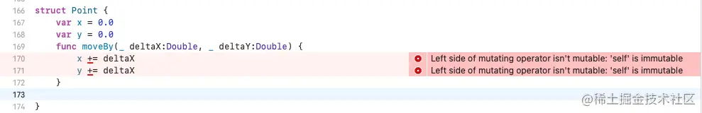 可以看到,如果要修改x或y的值就会有告警信息,提示:self是不可变的,那这个时候方法的前面加上 mutating关键字就可以解决这个问题了,这样就正常的输出结果