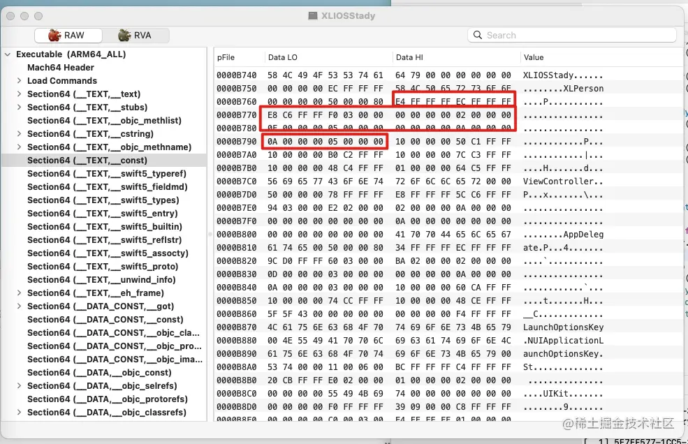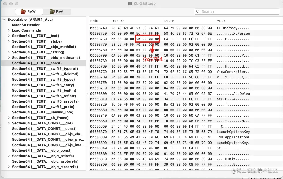 接下来来到Section64(__TEXT,__const),找到0000B760这一列,找到对应的B764对应的首地址