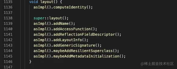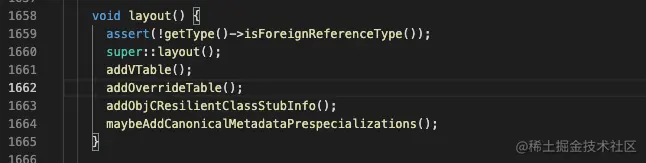要研究V-Table,我们需要看一下 typeDescriptor的数据结构,打开源码,来到GenMeta.cpp文件,找到 ClassContextDescriptorBuilder类,这个类中有个layout的函数