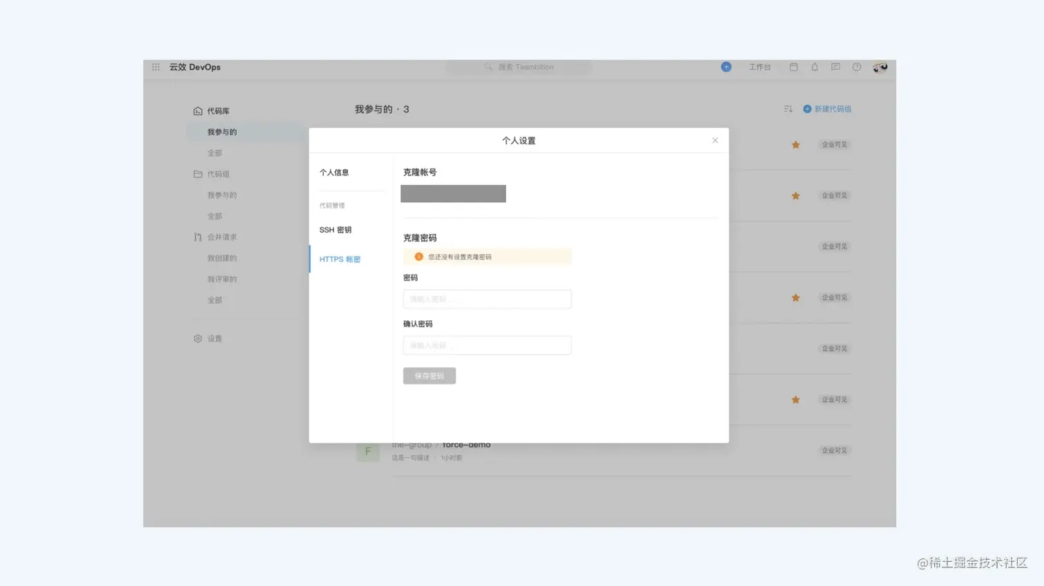 原因: 当你使用 HTTPS 的方式进行代码克隆行为时,需要输入账号密码进行验证,此时需要使用已设置的 HTTPS 账号密码进行验证,可以通过以下路径查看账号信息。