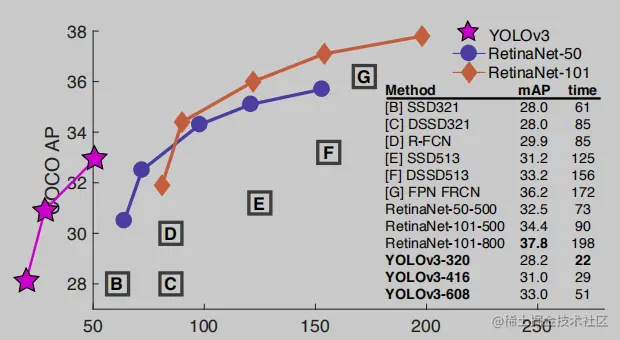 上图纵轴精度数据是 COCO AP,横轴效率数据在 Nvidia Titan X 上测得,可以看到 YOLOv3 相比 SSD、FRCN、RetinaNet 等检测网络,能更加好的兼顾效率和精度。