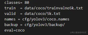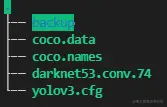其中 backup 为训练中间权重保存目录,coco.names 为类别名称,coco.data 为训练配置文件,差不多长这样: