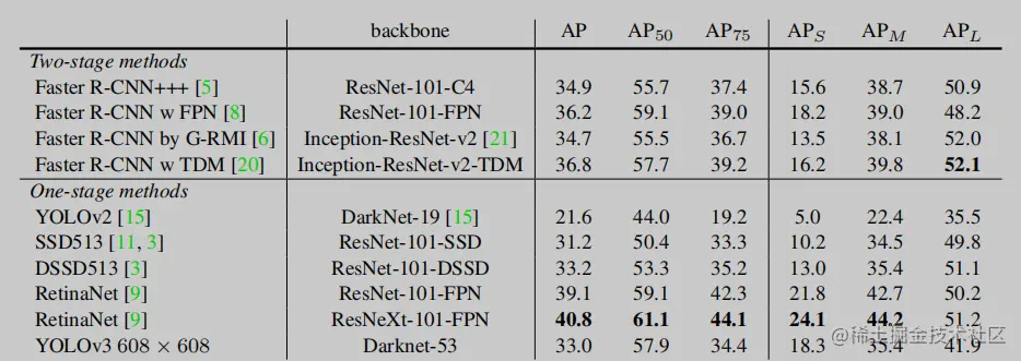 这里的数据比对将检测算法分为 Two-stage 和 One-stage,其中 Two-stage 检测算法以 Faster R-CNN 为代表,一般 Two-stage 的检测算法以精度著称,但由于检测过程 (两阶段:筛选候选区域 + 分类) 较为繁琐,所以前向效率不高,工程应用上比较少见。One-stage 检测算法这里罗列的比较多一些:YOLOv2、SSD、RetinaNet 还有 YOLOv3,One-stage 的算法以效率著称,并随着发展能逐步兼顾精度。纵观整个精度数据比对,可以看到在 COCO 数据集上, backbone 为 ResNeXt-101-FPN 的 RetinaNet 的 AP、AP50、AP75、APs、APm 均为最高,Faster R-CNN w TDM 的 APl 为最高。解释一下这些指标,在 COCO 数据集评价指标中,所有的 AP 默认均为 mAP,即 AP=mAP、AP50=mAP50 ... 递推。其中 AP 表示 IOU 阈值为 .05~0.95 的精度,AP50 表示 IOU 阈值为 .50 的精度,AP75 表示 IOU 阈值为 .75 的精度,APs 表示对于小目标 (area < 32^2) 的检测精度,APm 表示对于中目标 (32^2 < area < 96^2) 的检测精度,APl 表示对于大目标 (area > 96^2) 的检测精度。可以看出 RetinaNet 的 ResNeXt-101-FPN 的特征提取能力十分强悍,YOLOv3 比不过它,且 YOLOv3 也比不过 Faster R-CNN w TDM 在大目标上的检测能力。YOLOv3 的整体检测精度处于中上上水准,且改进了 YOLOv1&YOLOv2 中一直被诟病的小目标检测能力弱的问题,再结合它强大的推理效率,配得上文章中说的YOLOv3 is pretty good!