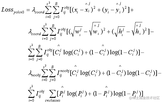为了更好的收敛和提升精度,YOLOv3 对损失函数也进行了一些改动,其中 x、y、w、h 损失采用 MSE 均方误差,置信度损失采用二分类交叉熵,分类损失采用多类别交叉熵进行计算,整体的损失函数如下: