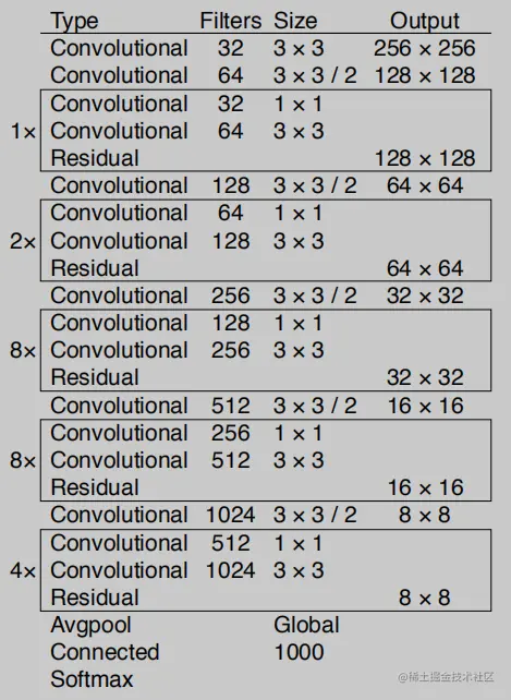 YOLOv2 中提出了 Darknet-19 作为 backbone,YOLOv3 在 Darknet-19 的基础上,借鉴 Resnet 的残差结构进一步加深网络深度,能够极大提高 backbone 的特征提取能力,Darknet-53 的结构如下: