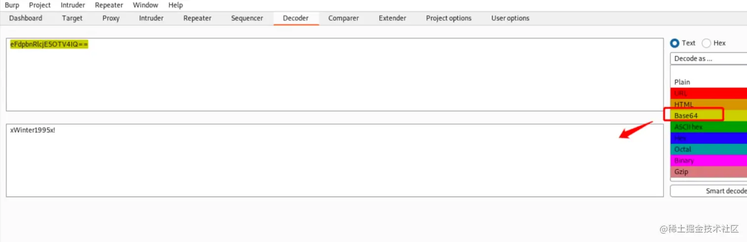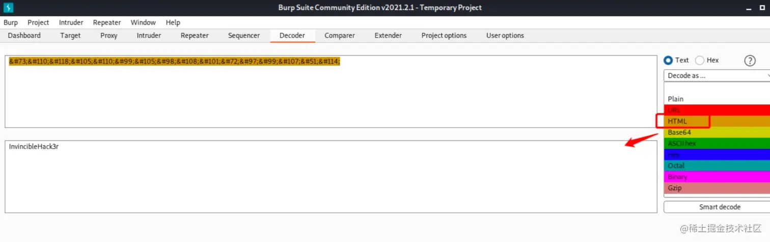 在Burpsuiter打开后在Decoder处进行HTML破解获取:InvincibleHack3r