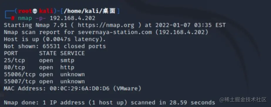 nmap -p- 192.168.4.202 (-p-:全端口扫描 -p3306:仅仅扫描3306端口)