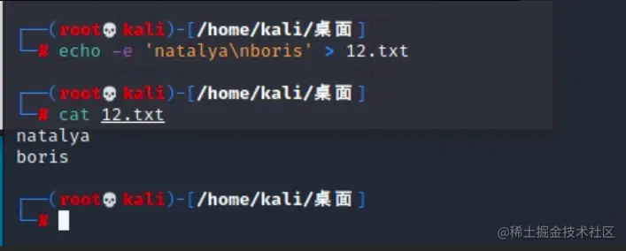 echo -e 'natalya\nboris' > 12.txt ---将两个用户名写入txt文本中