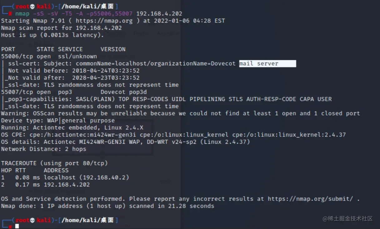 nmap -sS -sV -T5 -A -p55006,55007 192.168.4.202