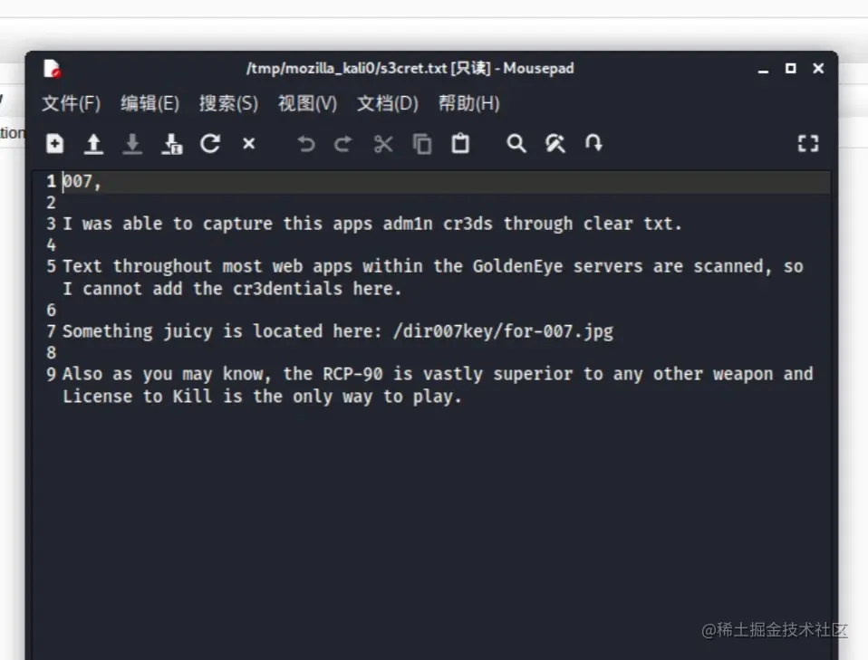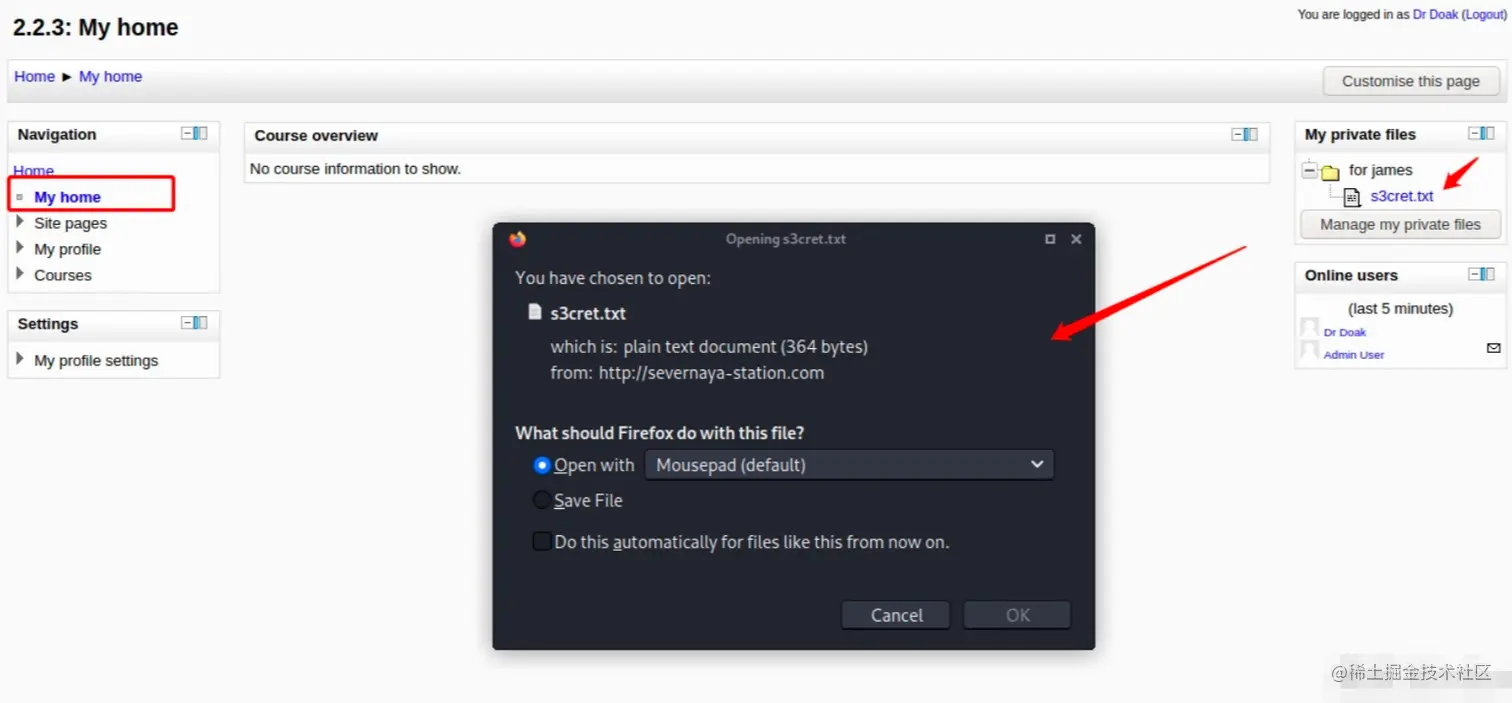 登录doak获得的用户名密码信息后在:Home / ▶ My home 右边发现: s3cret.txt文本信息,下载查看: