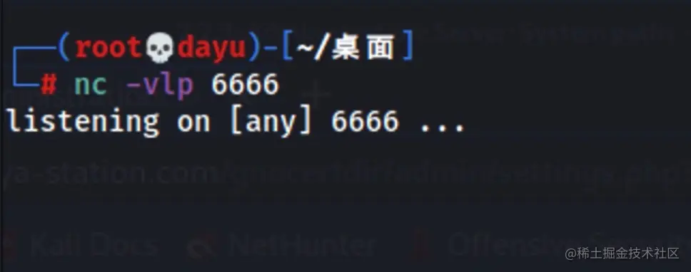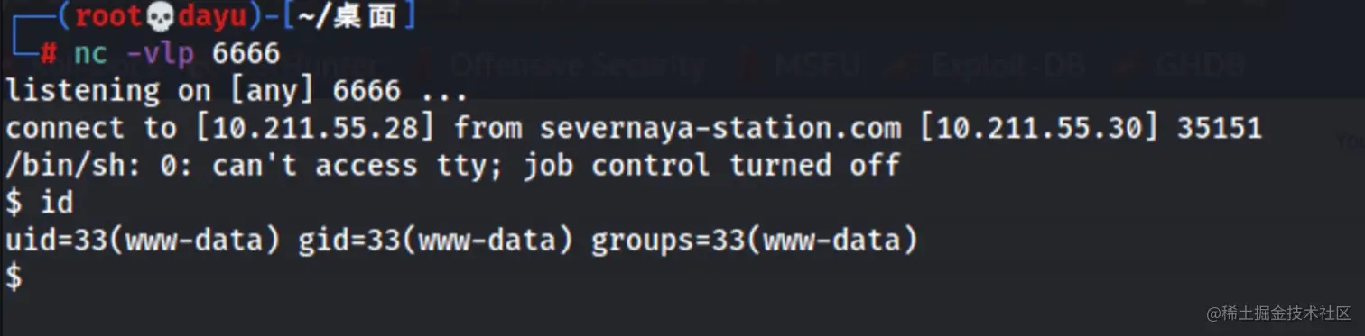 点击打钩处会进行回转,这时候就已经远程代码执行触发了,回到nc监听处看看: