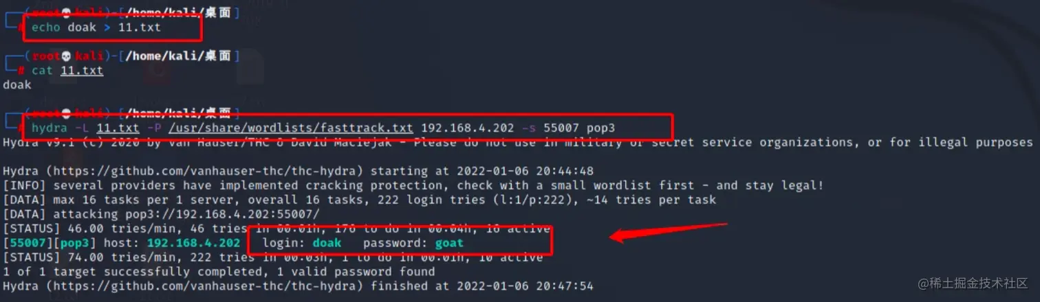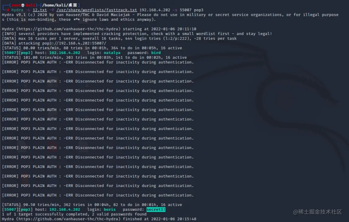 接下来尝试使用暴力破解,在上一步中找到的用户名“boris”,通过Hydra暴力破解pop3服务: