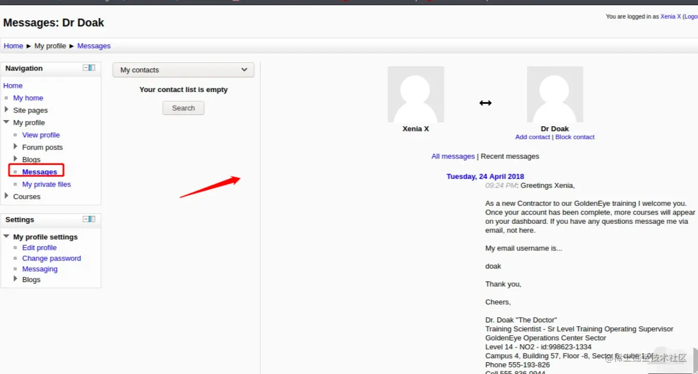 在信息枚举:Home / ▶ My profile / ▶ Messages --->发现有一封邮件,内容发现用户名doak: