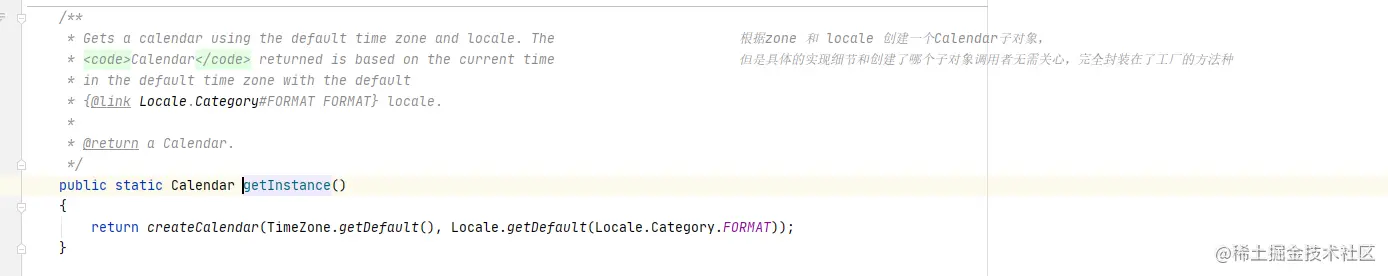 根据zone 和 locale 创建一个Calendar子对象,但是具体的实现细节和创建了哪个子对象调用者无需关心,完全封装在了工厂的方法中