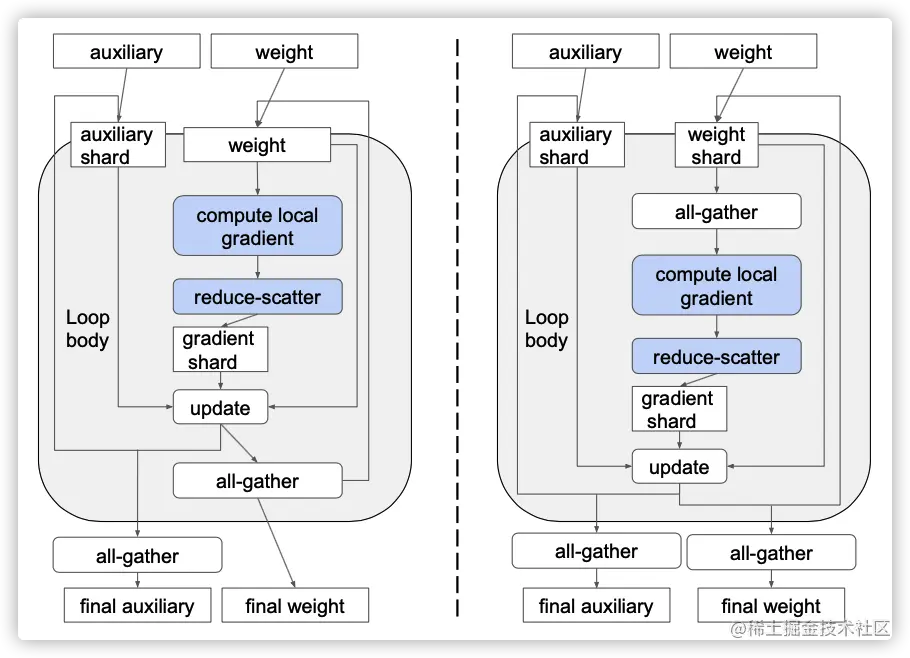 左图和右图的区分是:循环内权重的all-gather位置不同,左图是在update之后立即做weight all-gather,右图是计算梯度之前做weight all-gather,并且在跳出循环之后还要做一次all-gather。